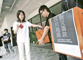 中新網(wǎng)5月15日電 據(jù)香港明報報道,四川災(zāi)情嚴(yán)峻,港人紛紛捐款賑災(zāi),短短兩日,中聯(lián)辦已收到香港各界逾1.3億元捐款。不同界別各出其謀籌款,香港教育界呼吁全港所有中小學(xué)生捐10元、教師捐100元賑災(zāi)。