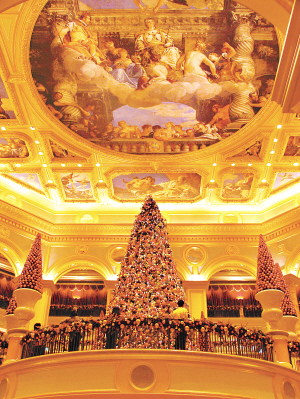 澳門的議事廳前地那一棵足有兩三層樓高的許愿樹燈飾會讓你眼前一亮,一層層藍(lán)盈盈小燈密密圍著,絲毫不會露出光裸電線,底下是制作頗為精細(xì)的大雪人,禮物堆,可愛得幾乎每個(gè)經(jīng)過的路人都忍不住要掏出手機(jī)去拍一張,小孩子更不用說了,嚷嚷要媽媽放開手好讓他爬上去拆禮物,看得人忍不住要會心微笑。然后郵政局門口那一棵許愿樹也十分華麗,而且是很別出心裁地“長”在了大門口,叫進(jìn)出的人都覺得自己是在天使庇佑之下似的,忍不住要在心里許個(gè)小小愿望。即使是在普通的非鬧市區(qū),馬路上也掛上了串串燈飾,顯得氣氛特別濃。至于各大娛樂場所里面的許愿樹,更是一棵賽一棵的漂亮,一層樓高的是小意思,兩層樓高的是普通規(guī)模,最夸張的是威尼斯人度假村,幾乎每隔一段距離就有一棵或大或小的許愿樹,上面還很細(xì)心地掛滿了蝴蝶結(jié)、許愿球、小禮物、小襪子……看得人又忍不住要掏手機(jī)來玩自拍,不過即使一棵一張,估計(jì)即使是512M的卡都會不夠用呢。