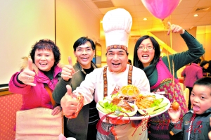歡樂新春八寶飯、萬家慶典年有魚、吉利鮑參長年菜、金錢財氣大雙拼、祥獅獻(xiàn)瑞興圍爐、富貴土雞、鴻運(yùn)大展椒鹽排、如意蒜泥紅鱘……廣州游客昨日享用的年夜飯價值8888元新臺幣一桌(約合1804元人民幣),包括豐盛的八菜一湯外加一個甜點(diǎn)和一個果盤,讓首次在祖國寶島上吃團(tuán)圓飯的廣州市民大贊“好味”。