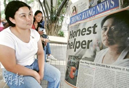 據香港《明報》報道,離鄉別井為兩餐,從菲律賓來港謀生的女傭Mildred Perez,不甘雇主對她做出的不法行為,訴諸法院,在候審期間不能另找工作,只靠拾荒維生,每天掙約38元生活費。有一天,她意外地得到一個可擺脫貧困的機會——在垃圾堆中拾獲35萬元巨款,但她把錢全數退還失主,雖然換來的只是一盒曲奇餅作答謝,但她并無后悔,繼續其撿破爛的日子。