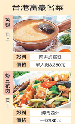 其中福臨門就是眾所公認的富豪飯堂,脆皮雞、燕窩、魚翅與荷葉糯米飯,在質量與口碑上都是一等一,價格也成正比,以套餐為例,一客魚翅、25頭吉品鮑、龍蝦、乳鴿、炒飯加燕窩要港幣2500元。此外鮑魚大王楊貫一的富臨飯店、四季酒店中米其林三星的龍景軒也都算得上是富豪飯堂。