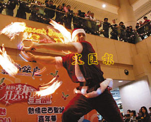 據(jù)香港文匯報(bào)報(bào)道,25日天水圍商場嘉湖銀座舉行了“圣誕火熱勁舞show”,邀請來自澳洲的火焰舞蹈團(tuán)到香港表演。3人組成的表演隊(duì)伍手持煙火,做出一系列高難度動作,包括跳舞、噴火、玩呼拉圈和踩高蹺,吸引在場大批小朋友拍手大笑和爭相與他們合照。