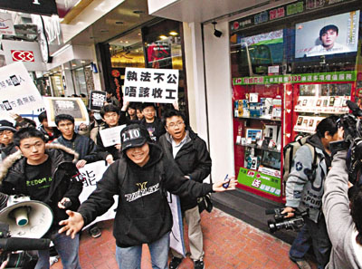 網民游行途經一間店鋪時,發現該店正重播陳冠希道歉片段的新聞,隨即起哄。