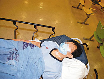 此時,有人突然情緒激動,順手拿起臺上一柄20公分長水果刀向妻子襲擊,直刺向她的喉嚨,藍某當場受傷倒臥血泊中,男戶主疑畏罪以利刀自割頸部尋死。