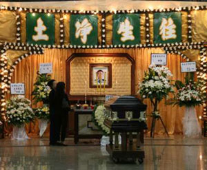 靈堂設(shè)于世界殯儀館一樓世界堂,布置莊嚴(yán)肅穆,靈堂正上方懸掛著“往生凈土”的橫幅,兩旁是“浩氣長存、哲人其萎”的挽聯(lián),下方擺放了蘇志豪生前的軍裝遺像,兩旁擺放著親屬敬獻的花籃,靈堂四周圍著白布,擺滿各界人士敬獻的花圈,兩輛紙扎警隊電單車放在靈堂旁邊。