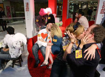 在鎂光燈的閃爍下,五對來自不同國家的情侶,坐上獨特的“愛情連椅”,他們要在眾目睽睽下,用各異的方式吻自己的愛侶,持續(xù)2分14秒。圍觀市民大感興趣,摒住呼吸觀賞現(xiàn)場的熱吻。