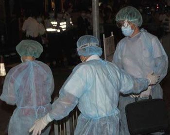 5日晚約9時,一輛救護車停泊在維景酒店門外,1名穿上“全副武裝”保護衣的醫護人員進入酒店,準備接走2名墨西哥人往機場。