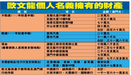 據(jù)澳門日報(bào)報(bào)道,澳門廉署首席調(diào)查員馮伯恩經(jīng)法庭批準(zhǔn),透過計(jì)算機(jī)輔助披露歐文龍以個(gè)人名義及透過家人擁有的財(cái)產(chǎn)。歐文龍財(cái)產(chǎn)中,主要由動(dòng)產(chǎn)、不動(dòng)產(chǎn)、有價(jià)值物品及澳門銀行存款組成,從物業(yè)登記處數(shù)據(jù)以及廉署在歐文龍司長辦公室、官邸及銀行保險(xiǎn)箱中搜獲的現(xiàn)金,涉及的款項(xiàng)逾一億元。