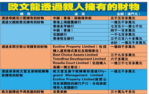 調(diào)查發(fā)現(xiàn),歐文龍透過其親屬,包括已故的母親范小云、父親歐榮光、弟弟歐文富及弟婦歐陳華彩等在港開設(shè)的保險(xiǎn)箱及賬戶,以及所操控的五家空殼公司,轉(zhuǎn)移巨額不法資產(chǎn)。