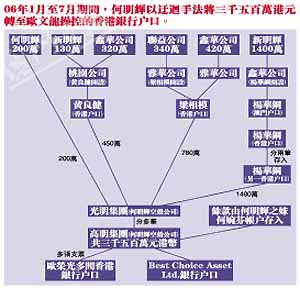 據澳門日報報道,澳門廉署調查何明輝涉嫌向歐文龍行賄的兩年多來,行賄手法愈趨迂回復雜。由最初只經一、兩層清洗,發展至最后階段賄款大都經過四至五層清洗,最多的甚至經過七層清洗,方輾轉流入由歐文龍實際操控的香港銀行賬戶。