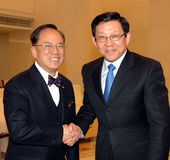 曾蔭權6日在北京會見傳媒時表示,5、6日兩天與不少國家部委見面,并列席5日舉行的第11屆全國人大第1次會議開幕禮。他表示,與汪洋會面時,探討了如何推進粵港合作,包括基建、跨境人流、貨流和資金流如何更順暢等,特別是香港的服務業如何能在廣東省擴展業務。
