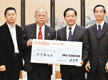 恒基兆業集團主席李兆基亦于14日委托次子李家誠送交由恒基兆業地產有限公司和中華煤氣公司捐贈的1000萬元賑災支票。