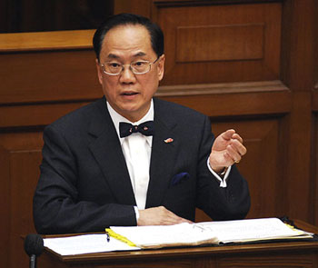 五月十五日,香港特別行政區行政長官曾蔭權出席立法會會議,答復議員的提問。 中新社發 譚達明 攝
