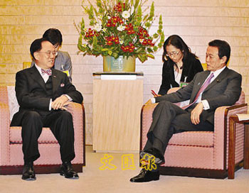 2月16日,香港特別行政區行政長官曾蔭權開始對日本的正式訪問。這是他就任特首以來首次訪日,受到日本政經各界的歡迎。圖為16日傍晚,曾蔭權在東京與日本外相中曾根弘文舉行會談。 中新社發 朱沿華 攝