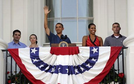 在第一夫人米歇爾的陪伴下,奧巴馬在白宮南草坪發(fā)表了講話。奧巴馬夫婦邀請(qǐng)了1200位賓客,其中有現(xiàn)役軍人、傷殘士兵、海外人士、和陣亡士兵家屬等等。
