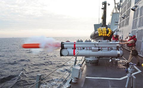 據報道,反潛攻擊演習在韓國江原道江陵、巨津東側海域舉行,以25日和26日的反潛探測演習為基礎,當天實施了攻擊已被探測的潛艇的演習。韓國軍方相關人士說:“4500噸級韓國型驅逐艦(KDX-Ⅱ)‘崔瑩’號向假想潛艇發射了韓國產輕魚雷‘青鯊’。‘崔瑩’號憑借魚雷誘餌系統(TACM)避開敵方魚雷后,向周邊艦艇下達了攻擊潛艇的命令。”