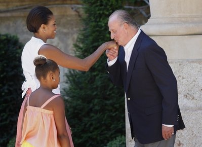 據(jù)報(bào)道,米歇爾和薩莎在當(dāng)?shù)貢r(shí)間8日下午不到1點(diǎn),抵達(dá)西班牙國(guó)王卡洛斯和王后索菲婭度假的馬略卡行宮。國(guó)王、皇后親自在門前迎接。