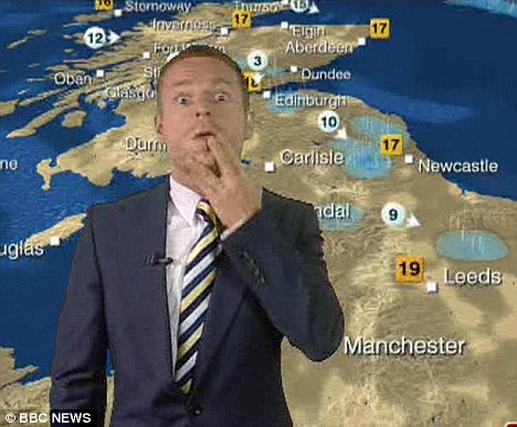 英國廣播公司天氣節目主播日前在節目中做出令人大跌眼鏡的舉動,他當眾朝新聞主播豎中指引發熱議。