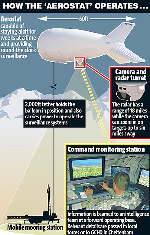 據報道,這種長約60英尺(約合18.3米)的氣球造價每個約為500萬英鎊,被駐阿富汗英國軍隊放置在高2000英尺(約合610米)的空中,下面栓著鋼鐵纜繩,將氣球固定住,同時通過纜繩將信號傳遞到電子基站。這種裝置能夠非常有效地偵測塔利班武裝分子的行蹤。