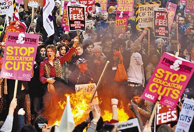 中新網11月12日電 據香港《文匯報》12日報道,英國10日爆發首場反對財政緊縮措施的暴力示威,5萬名學生在首都倫敦上街抗議,反對政府削減教育開支,并大幅上調每年學費至9000英鎊(約合9.6萬元人民幣),是現水平的3倍。后來,示威演變成暴力沖突,部分人沖進保守黨總部大樓,破壞接待處和大堂,有人從天臺投擲雜物。事件中有14人受傷,32人被捕。首相卡梅倫譴責了此次事件,稱不能接受暴力行為。