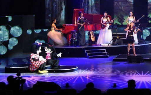 據(jù)報(bào)道,牡丹峰樂團(tuán)由金正恩親自組建,他觀看的這次演出包括美國迪士尼系列的歌舞劇。表演者打扮成米老鼠,小熊維尼等迪士尼知名卡通形象在舞臺上進(jìn)行表演,同時(shí)巨大背景屏幕上播放著“白雪公主”、“美女與野獸”等迪士尼電影片段。