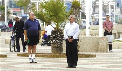 2004年4月19日,耶路撒冷,汽笛聲中行人原地站立默哀。