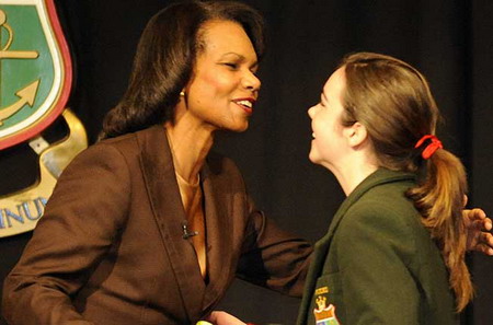 賴斯隨后前往柏斯市歷史第二悠久的中學訪問,史密斯的女兒麥迪也在這所中學就讀。該校的450名女孩子熱烈歡迎了賴斯,并向她提出了問題。賴斯在學校大廳回答了女學生們提出了六七個問題,學生們在她回答問題后給予了熱烈的掌聲。作為學校的一個禮物,學校合唱團為賴斯演唱了《What a Wonderful Day》。賴斯對此表示感謝,她說:“這是我最喜愛的一首歌曲。”學校還向賴斯贈送了一本反映該校150年歷史的書籍,她們在賴斯離開時全體起立歡呼。賴斯隨后前往柏斯市西部的澳大利亞特別空勤團軍營進行訪問。