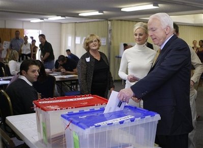 中新網11月5日電 據法新社報道,美國共和黨總統候選人麥凱恩4日在妻子辛迪的陪同下在亞利桑那州進行了投票。