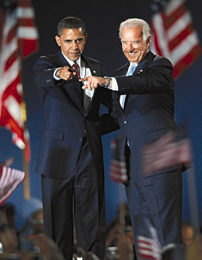 在芝加哥的慶祝大會上,奧巴馬與副手拜登開心與支持者互動。