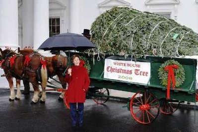 美國“第一夫人”勞拉30日在白宮門前冒雨迎接圣誕樹,這已經是她第8次亦是最后一次以白宮主人身份主持簡單的接受儀式。她的丈夫喬治-布什即將卸任總統,之后兩人便會告別白宮。