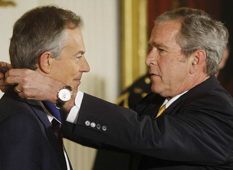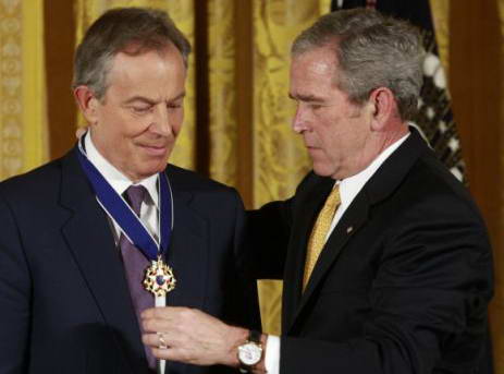 布什稱,布萊爾是美國“真正的朋友”,布萊爾非常堅韌地應對了歷史的挑戰,做出了一個國際政治家的榜樣。布什稱:“布萊爾相信自由,相信免于壓迫的自由、免于饑餓的自由、免于疾病的自由、免于恐懼和絕望的自由。他雖然已卸任,但仍積極參加公眾事務。布萊爾仍然是一位擁有很高智力和遠見的人士。最重要的是,他是一位有信仰的人,是一位理想主義者,是一位正直的人。”布什總統13日還向哥倫比亞總統烏里韋、澳大利亞前總理霍華德頒發了“總統自由勛章”。布什在8年的總統生涯共頒發了78枚總統自由勛章。