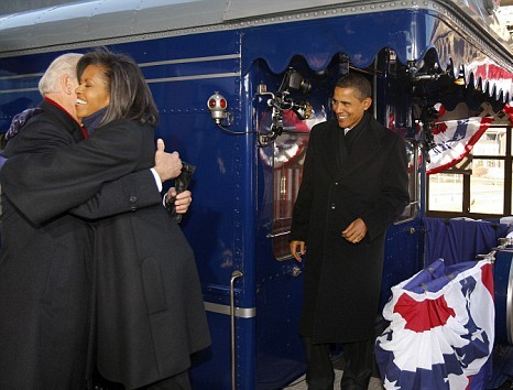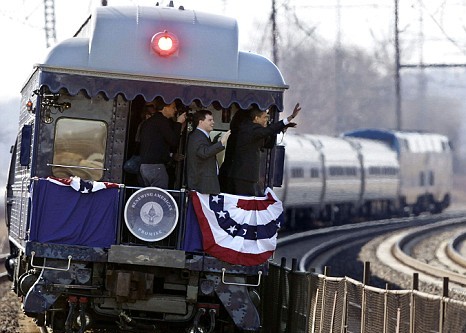 奧巴馬在乘坐專列由費城啟程前往首都華盛頓途中,開始總統就職的一系列活動。當天也是其妻子米歇爾45歲的生日,他們在火車上慶祝,兩人沿途又向群眾揮手,很多人夾道歡呼,有人舉起寫上“米歇爾生日快樂”的標語牌。