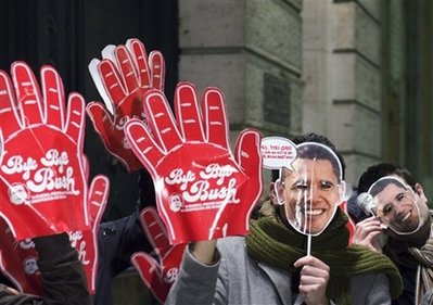 奧巴馬18日在林肯紀念堂五十萬人出席的音樂會上,感謝出席人潮擁抱寒冷。音樂會開場兩小時后,奧巴馬與未來的第一夫人米歇爾出現在林肯紀念堂前,現場頓時沸騰。從林肯紀念堂到反思池,再到一公里外的華盛頓紀念方碑,人們一邊歡呼,一邊試圖用相機記錄下這歷史性的一刻。