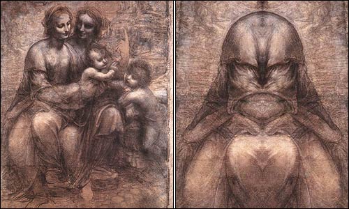 畫(huà)作“圣母子與圣安妮”中,似乎也反射出類(lèi)似影像。專(zhuān)家說(shuō),達(dá)芬奇打算藉畫(huà)作表現(xiàn)出上帝本身,并且激發(fā)恐懼。在“施洗者約翰”畫(huà)作中也藏著另一幅圖像,。而以鏡子反射“最后的晚餐”,似乎也會(huì)發(fā)現(xiàn)圣杯倒放在桌上。