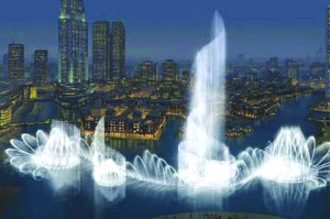 繼興建818米高的“迪拜塔”之后,阿聯(lián)酋地產(chǎn)巨頭艾瑪爾地產(chǎn)公司近日宣布,將在這座世界第一高樓附近打造一座世界最大噴泉。該噴泉高150米,長275米,相當(dāng)于兩個足球場長,可以變幻1000種造型,耗資高達(dá)2.18億美元,將于2009年投入使用。一旦竣工,它將成為迪拜市又一地標(biāo)性景觀,預(yù)計每年將吸引1000萬名國際游客。目前,艾瑪爾地產(chǎn)公司懸賞27225美元,為這座噴泉征集“靚名”。
