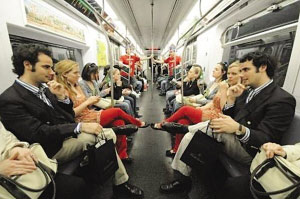 日前,15對同卵雙胞胎按照亞當斯的要求,一起在紐約市布魯克林橋的地鐵站碰頭,15對同卵雙胞胎走進地鐵車廂后,每對雙胞胎都排著隊各自坐在了過道兩側的座位上,并且每個雙胞胎要直接面對著自己的雙胞胎兄弟或姐妹。當15對雙胞胎“各就各位”后,他們接下來要做的事就是盡可能保持動作一致,如果一個雙胞胎用手撓頭,那么他的同卵雙胞胎也必須用手撓頭;一個雙胞胎看報紙,他的同卵雙胞胎也必須低頭看報紙。總之,他們就好像是對方的“鏡中影像”一樣。這些同卵雙胞胎還被告知,如果有乘客詢問他們到底發生了什么事,他們要表現得一無所知,甚至好像壓根沒看到坐在自己對面的同卵雙胞胎一樣。