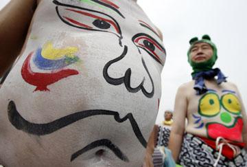 近日,日本的澀川市舉行“肚臍眼”節。節日期間,市民們在自己的肚皮上涂上五顏六色的圖案,然后走上街道,載歌載舞。