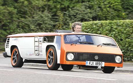 這輛露營車被命名為“敞篷蛋糕(Van-Cake)”,時(shí)速最高可達(dá)128公里/小時(shí)。桑德斯的團(tuán)隊(duì)將原有大眾車1.38米高的頂棚切割掉,改裝成了一個(gè)35厘米高的頂棚。他們?cè)谲噧?nèi)放入新的操縱系統(tǒng)和低矮的座位。受制于空間,這輛車不是使用腳剎,取而代之的是手動(dòng)剎車和變速桿;燃料槽也是經(jīng)過特別制作的。目前已經(jīng)取得合法上路的資格。由于這輛車非常矮,它可以輕松地從停車場(chǎng)柵欄下通過。