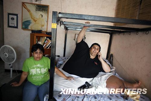 10月2日,在墨北部城市蒙特雷,體形肥胖的曼努埃爾·烏里韋(右)與女友格拉迪亞·索利斯在家中。烏里韋體重曾達到560公斤,被《吉尼斯世界紀錄大全》列為世界最胖之人。經過兩年多的減肥治療,他目前體重已降至310公斤左右。烏里韋近日宣布,他將在本月26日迎娶相戀兩年半的女友。新華社/路透