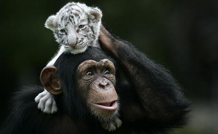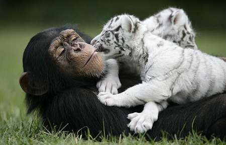 這頭非常聰明的猩猩名叫安賈娜,她目前是那對白虎幼仔兄弟最好的伙伴。安賈娜一直在幫助飼養(yǎng)員照料23天大的白虎幼仔米特拉和什娃,她還曾幫助飼養(yǎng)員照料過豹子和獅子的幼仔。