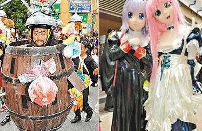 游行隊伍中,一名男子以啤酒桶裝現身,頭盔還掛上各種吊飾,成為矚目焦點。還有兩名女子戴上面具,打扮成漫畫美少女。