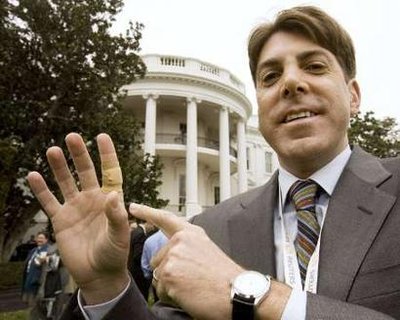 路透社記者德克伸出被美國總統布什的愛犬巴尼咬了一口的食指。