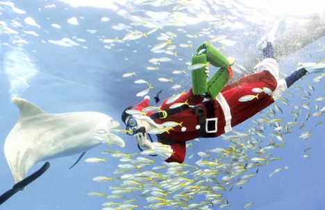 中新網12月1日電 綜合報道,一名扮成圣誕老人的潛水員30日在日本橫濱八景島海洋樂園的水族箱內喂一頭白鯨。這是圣誕節前的應景表演。