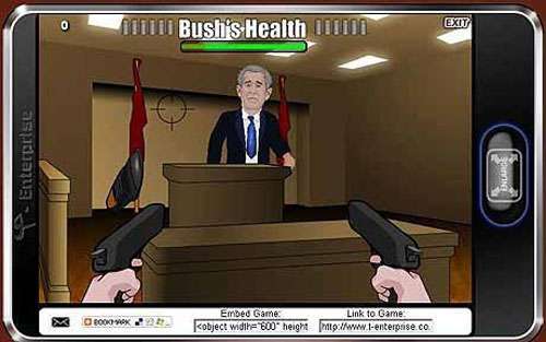 據了解,《布什靴營》的玩家可扮演一名保安特工,玩家必須在突然擲出的鞋擊中總統之前開槍把鞋擊落。玩家們只要滑動鼠標,瞄準槍上的十字絲,然后開火就行了。每次布什總統誤中槍火或被鞋子擊中,他的“生命”便會減少。當生命減至零時玩家便輸了。