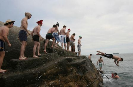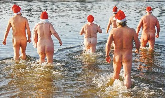 中新網12月26日電 綜合報道,德國柏林冬泳會“柏林海豹”多位成員25日不畏嚴寒,照樣在當地的歐蘭基西湖下水游泳,只是頭上多了應景的圣誕老人帽。