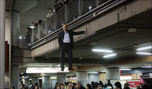 據英國《太陽報》2月11日報道,在西班牙馬德里阿托查火車站,一名德國藝術家約亨寧•洛爾貝爾站在車頂似乎站在“空中”的乘車方式雷倒眾人。(環球時報記者王斯)