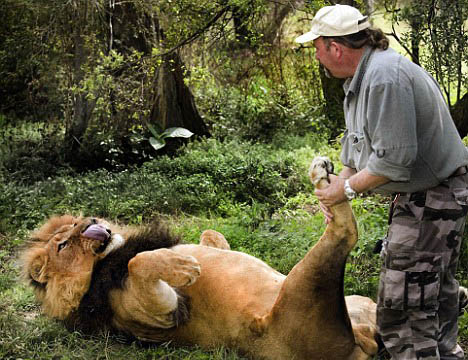 據英國《每日電訊報》報道,英國人亞歷克斯·勞倫提今年50歲,有兩個孩子。他在南非約憨內斯堡附近的獅子公園里工作,負責照料75頭野性十足的獅子。和他關系最親密的是一頭叫賈穆的8歲雄獅。在照片上,他不但和賈穆摟摟抱抱,還為它按摩腳掌,賈穆看上去則十分舒適自在。亞歷克斯說,他花了6年時間才和賈穆達到目前的和諧關系。