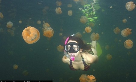 無(wú)毒水母為食草性,主要是靠海藻分泌的營(yíng)養(yǎng)素維生,因此水母散發(fā)著淡淡的橘色光茫,湖中亦有大群的銀面魚(yú)及透明的月亮水母,全都是溫和無(wú)毒的。