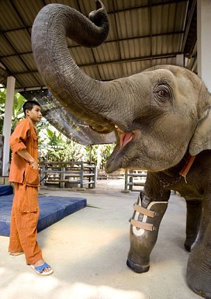 中新網3月10日電 據英國《每日郵報》報道,在泰國南邦府,一只亞洲象兩年前不幸觸雷后,前右腿慘遭炸毀。后來這只亞洲象安裝上假肢,不久將可重返叢林生活。