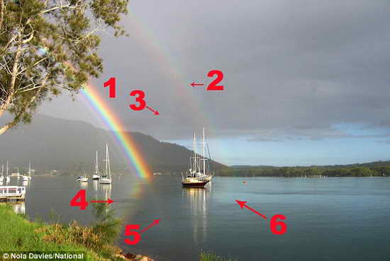人們幾乎看不清楚第六道彩虹,但是考利博士堅持稱,如果你認真看,你就能看到第六道彩虹。他說:“諾拉的照相機只拍到了第六道彩虹(圖示6)的部分,它是河面的一次反射,雨滴內的兩次反射形成的。由于進行了多次反射,其顏色被擴散出去,它的外貌僅依稀可見。”(周翔/中國網3月18日訊)